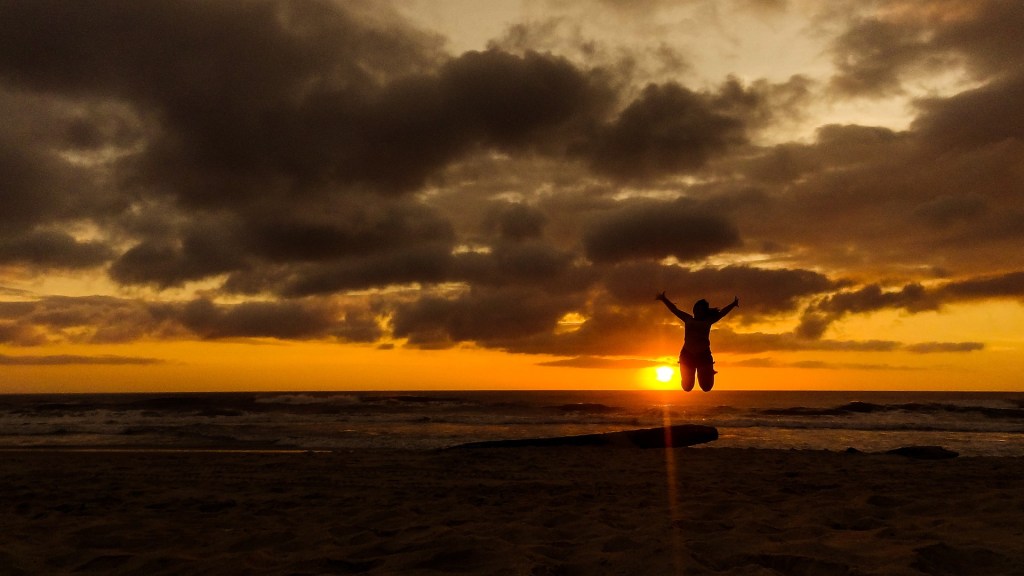 Jake se sacode e vamos para a praia ver o pôr do sol.